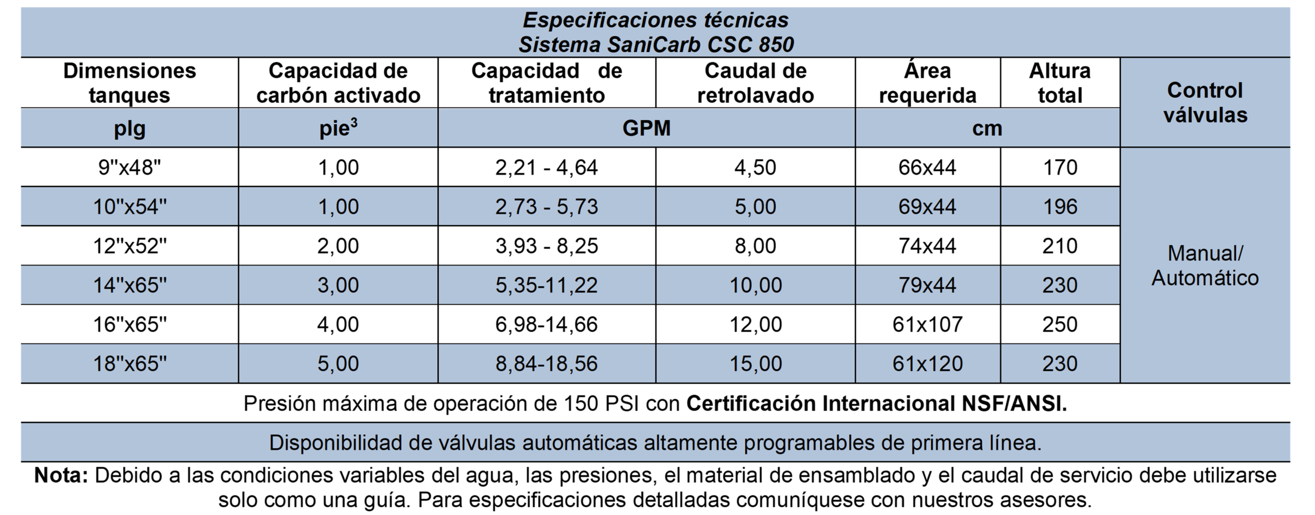 El sistema utiliza SaniCarb CSC 850, un carbón activado granular de alta calidad, fabricado a partir de cáscara de coco seleccionada y activado por proceso a vapor. Gracias a su alta microporosidad, permite la eliminación efectiva de cloro libre y cloro combinado, así como la reducción de olores y sabores, color orgánico, trihalometanos (THM), compuestos orgánicos, carbono orgánico total (TOC) y otros contaminantes que afectan la calidad del agua.