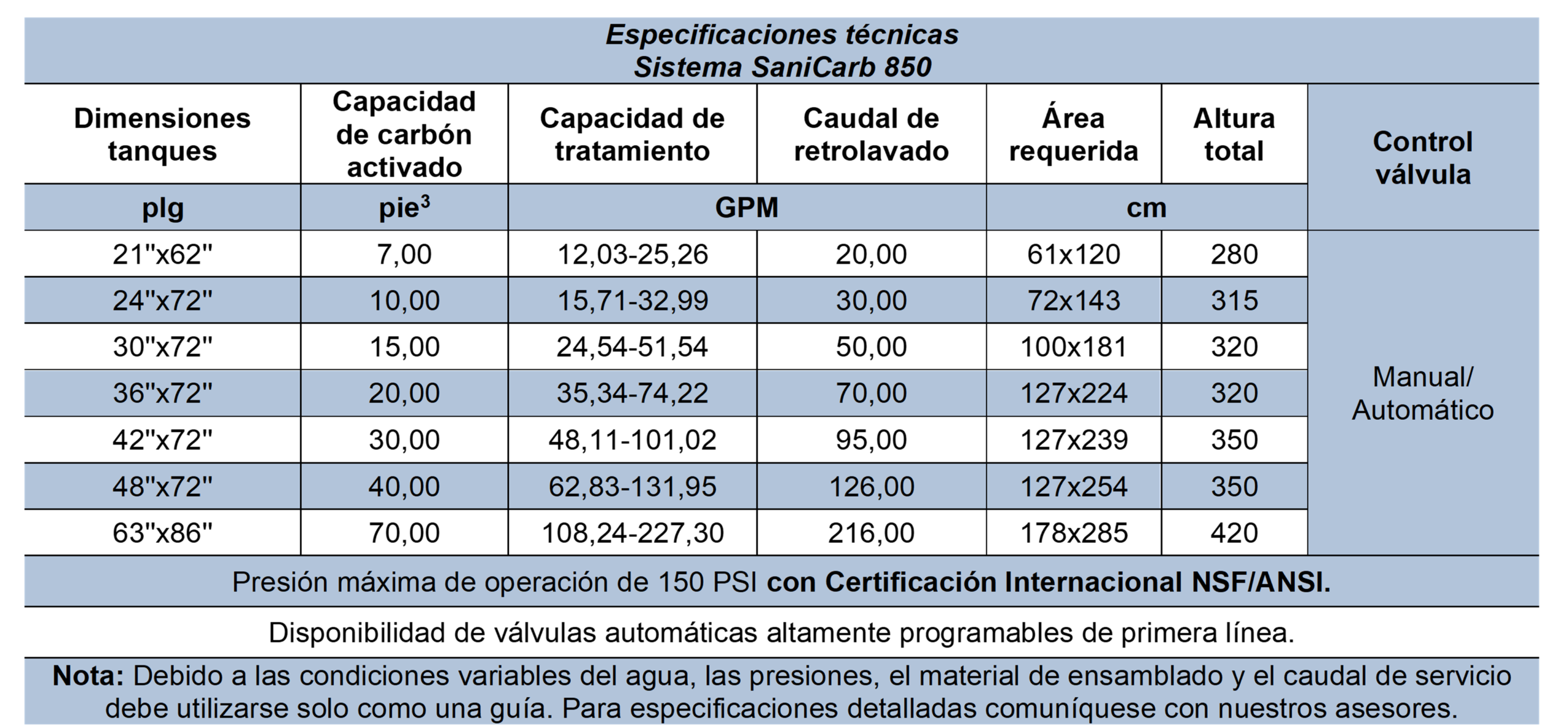 El sistema utiliza SaniCarb CSC 850, un carbón activado granular de alta capacidad, fabricado a partir de cáscara de coco seleccionada y activado mediante proceso a vapor. Su microporosidad optimizada permite una eficiente remoción de cloro libre, cloro combinado y agentes oxidantes como ozono, así como la eliminación de compuestos orgánicos de bajo peso molecular, trihalometanos (THM) como el cloroformo, color orgánico, olores y sabores, carbono orgánico total (TOC) y diversos productos químicos industriales.